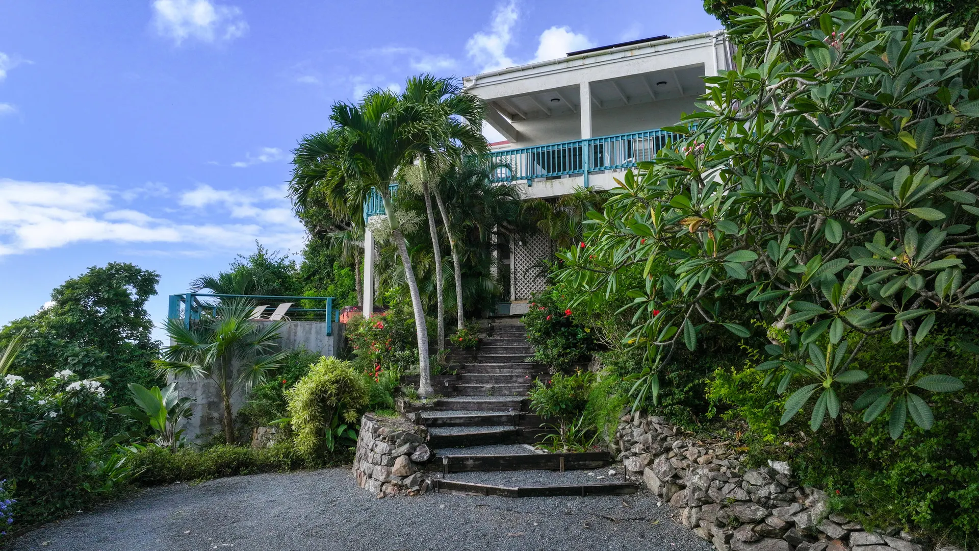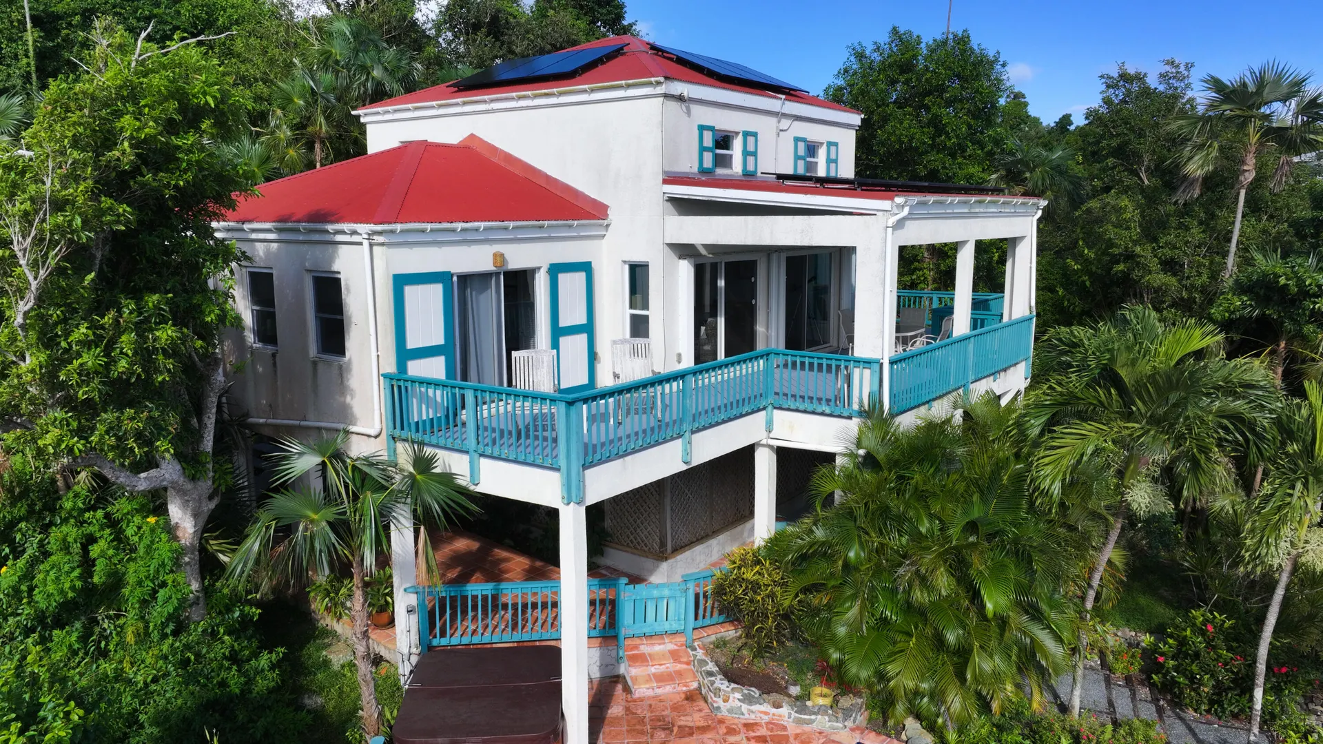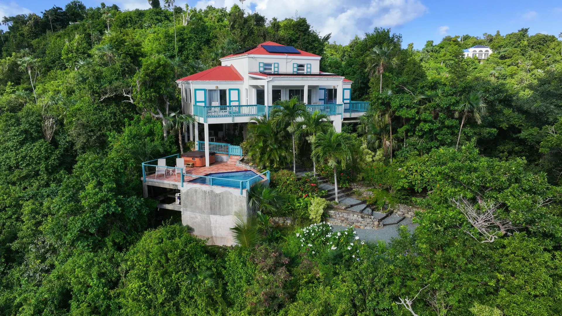Notre Ciel is situated on a lush 3/4- acre parcel on Mamey Peak perfectly tucked into the mountain side for optimal privacy, dramatic sea views and comfortable trade winds. This well-maintained masonryhome offers two bedrooms, two baths, a loft bedroom, tiled pool deck, masonry pool and a hot tub. Combined with strong short term rental history, newer windows throughout and 2 Telsa power walls- Notre Ciel leaves you yearning for nothing. Buyer to honor all confirmed rental reservations. Buyer and Seller to split stamp tax.
