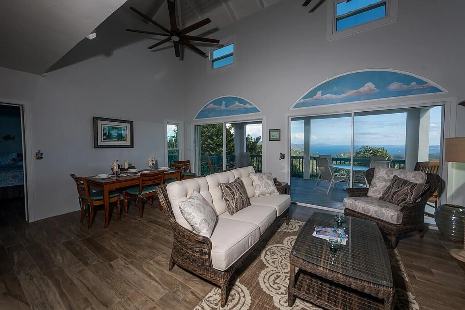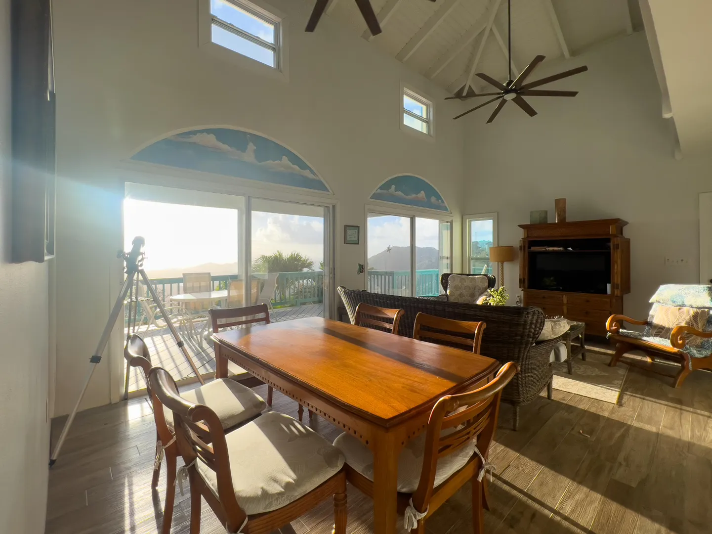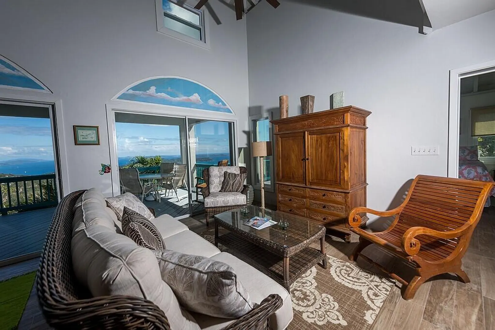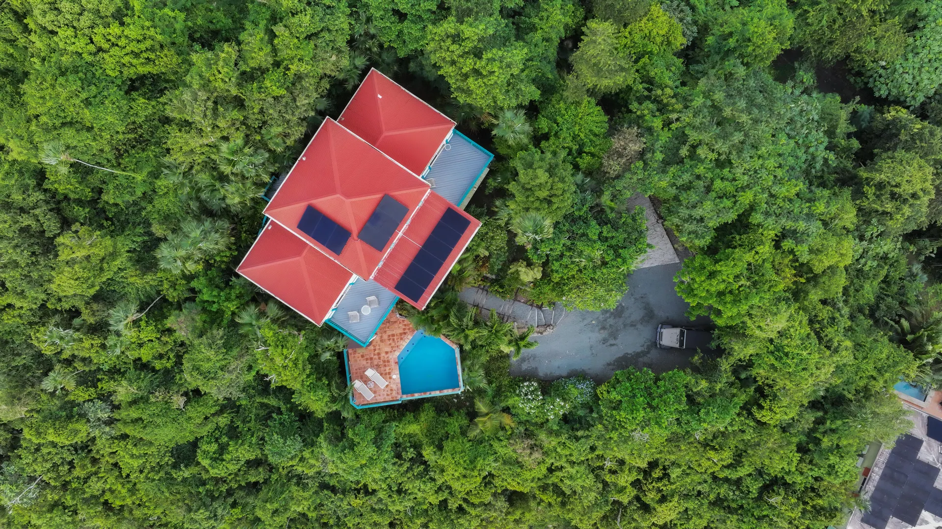 Notre Ciel is situated on a lush 3/4- acre parcel on Mamey Peak perfectly tucked into the mountain side for optimal privacy, dramatic sea views and comfortable trade winds. This well-maintained masonryhome offers two bedrooms, two baths, a loft bedroom, tiled pool deck, masonry pool and a hot tub. Combined with strong short term rental history, newer windows throughout and 2 Telsa power walls- Notre Ciel leaves you yearning for nothing. Buyer to honor all confirmed rental reservations. Buyer and Seller to split stamp tax.