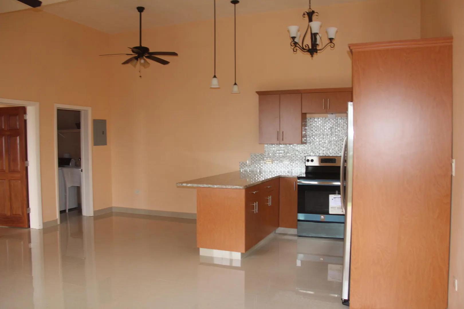 Brand New beautiful 1BR/1BA Apartment on the Northside in Solberg. This very spacious, recently built house has high ceilings, large kitchen and bedrooms is partially furnished with stainless steel appliances, washer and dryer, separate WAPA meter, cistern, professionally landscaped and automatic generator. No Pets.