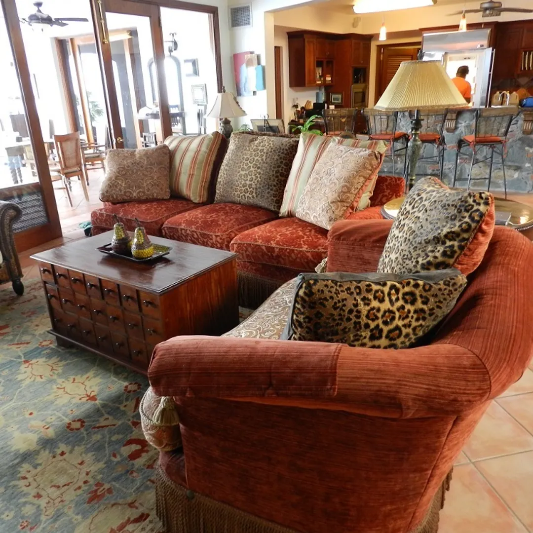 An Elegant, exceptionally well built and custom detailed villa, on double lot inside the gated golf community of mahogany Run. Exceptional interior details, cathedral ceilings, genuine game room and media room, spectacular formal dining area with adjoining glass from wine room. Expansive covered tiled decks overlook pool. Covered garage, caretakers apartment, gated stunning circular drive entranc