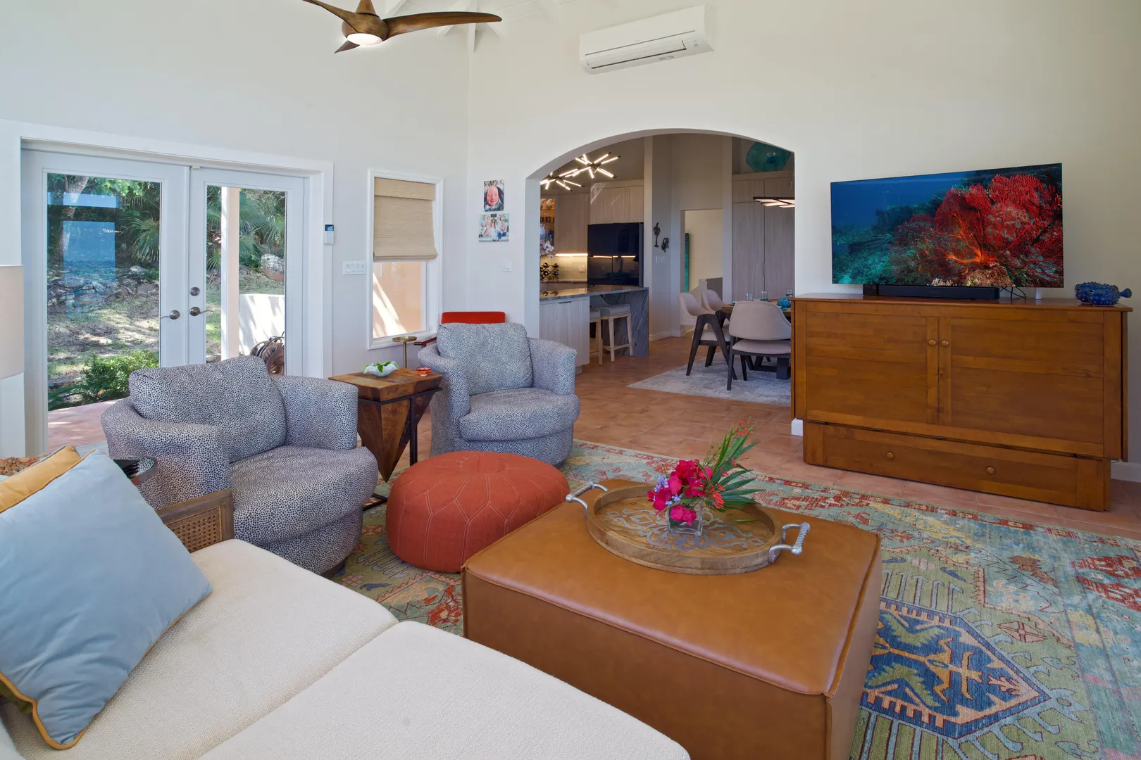 A truly stunning, turn-key luxury retreat in centrally located and gated Mahogany Run. This impeccably renovated 3-bedroom, 3.5-bathroom residence offers breathtaking panoramic views of Hans Lollick and down island. Every inch of the home has been thoughtfully redone to the highest standards, creating a seamless blend of modern elegance and island living. The open and airy interior features a brand-new chef's kitchen and beautifully redesigned bathrooms throughout, all finished with premium materials and attention to detail. Expansive living spaces flow effortlessly to the outdoor areas, where a sparkling saltwater pool invites you to relax and take in the spectacular Caribbean vistas.Perfectly set up for entertaining with multiple covered decks, indoor/outdoor connection and a cabana complete with grill, mini fridge, dry bar, and a TV. Designed for comfort, efficiency, and peace of mind, the home is equipped with a generator and solar power system - it even has an electric car charging set station. Offered fully turn-key and meticulously maintained, this exceptional property has never been a short term rental but would ideal as a primary residence, luxury vacation home, or high-end investment opportunity.