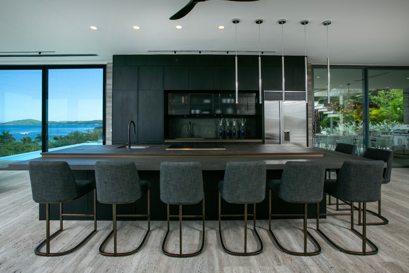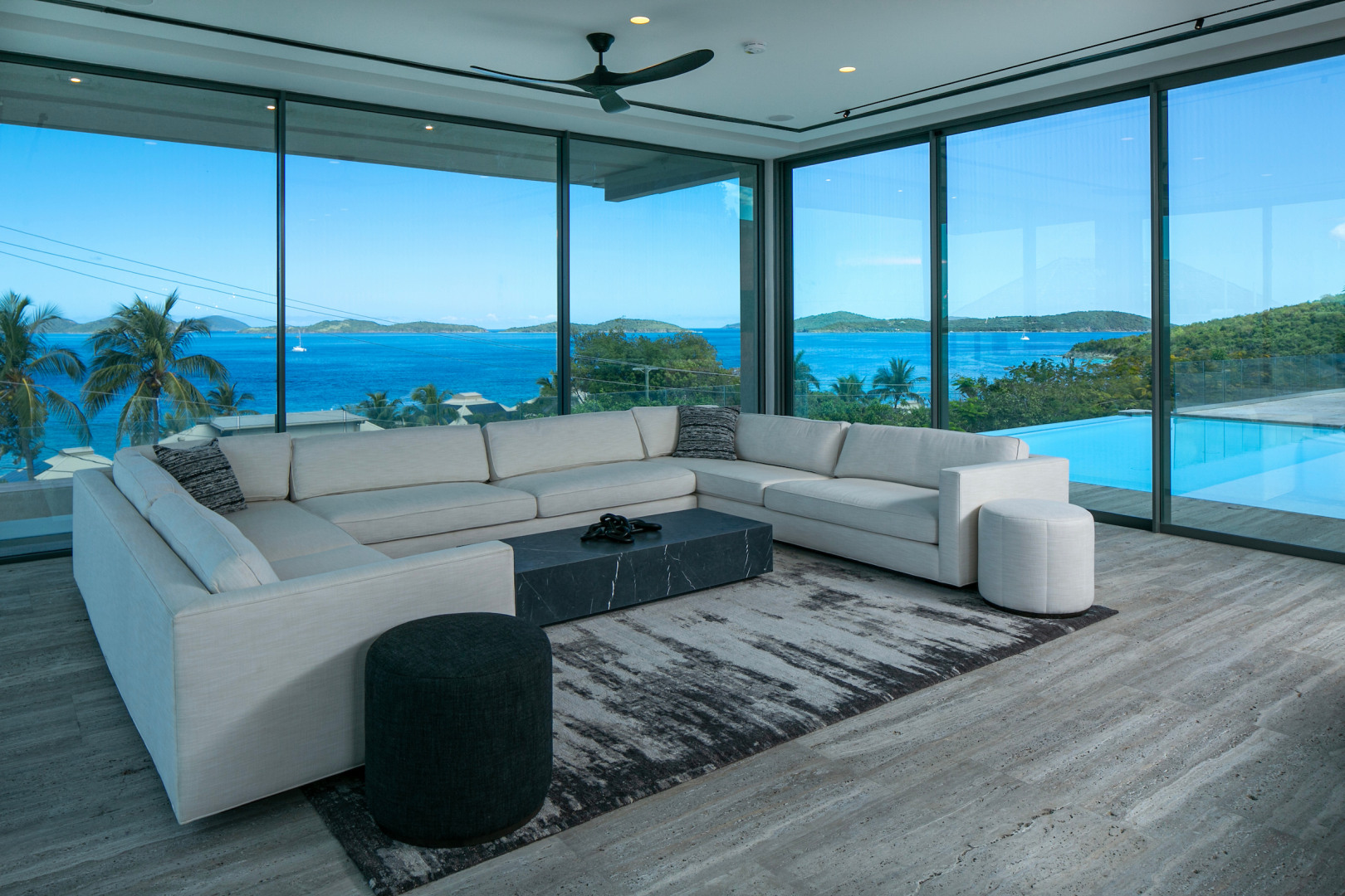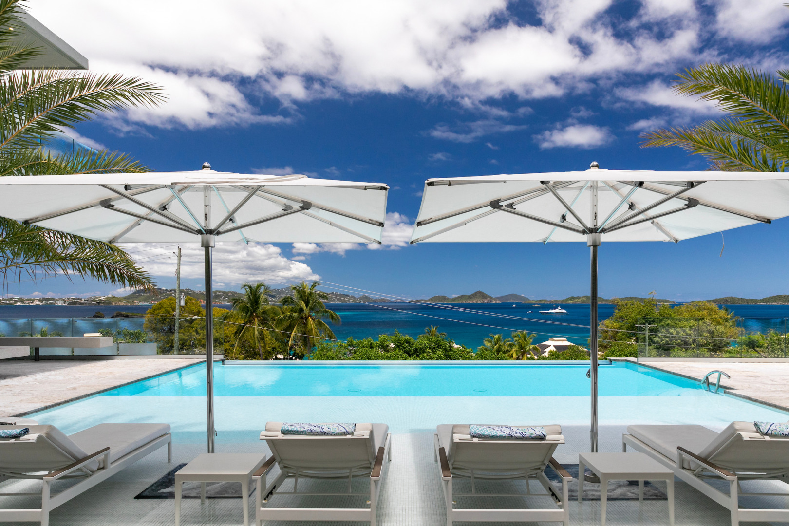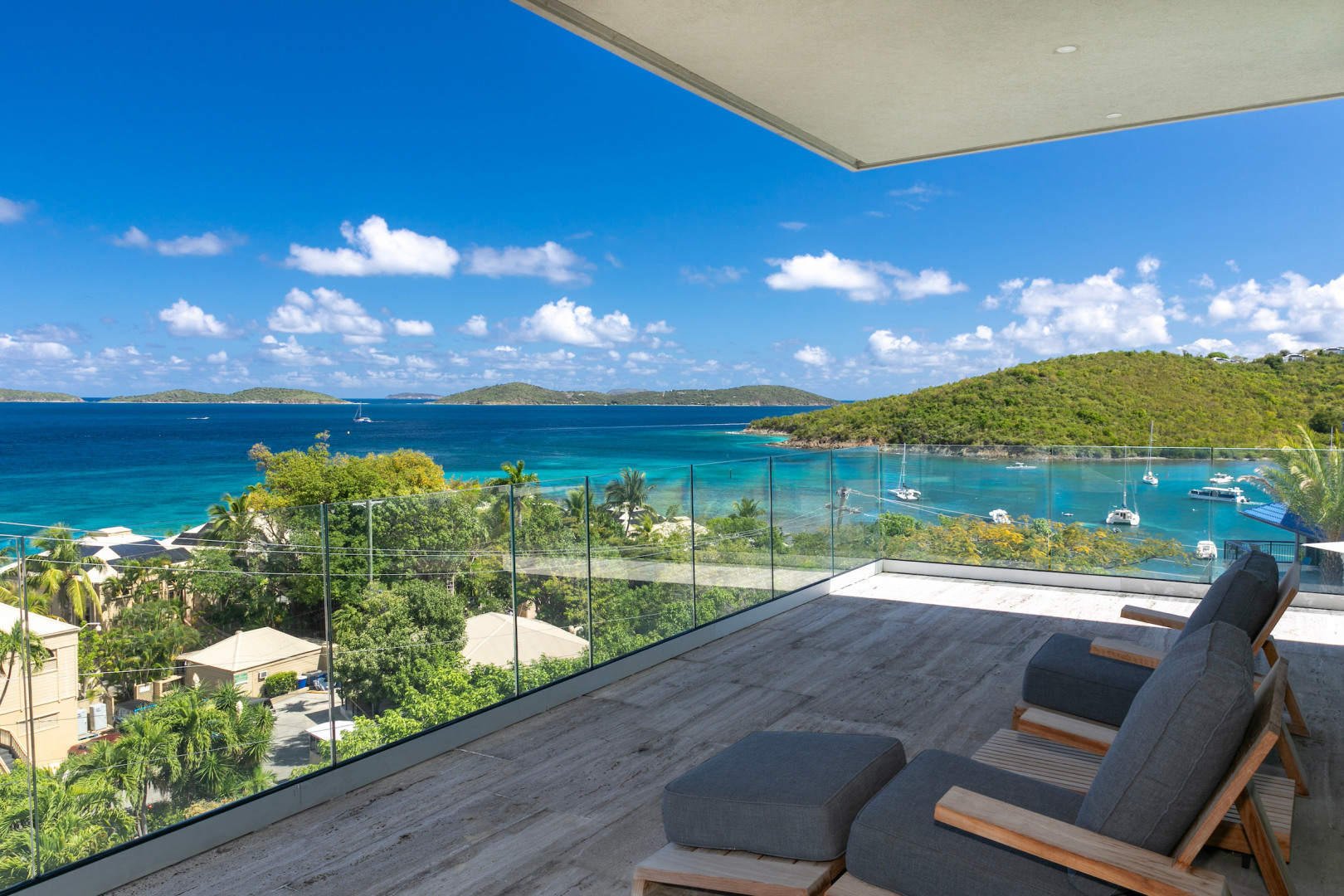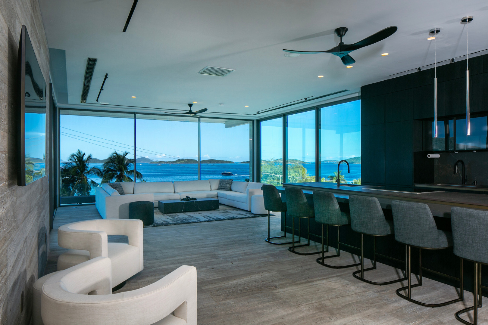 Tucked in the heart of Cruz Bay, St. John, Blue Rock is a newly built, off-grid luxury home that blends cutting-edge sustainability with sleek, modern design and unbeatable in-town convenience. Powered by 10 Tesla Powerwall's and featuring five cisterns, this eco-conscious residence offers full self-sufficiency without compromising comfort. Highlights include a chef’s kitchen with Sub-Zero and Wolf appliances, a private master suite with elevator access, dual showers and its own garage, plus a separate guest wing with three bedrooms, a gym and a kitchenette. Floor-to-ceiling glass opens to panoramic views, a beach-entry infinity pool and an outdoor lounge built for entertaining. Every inch has been crafted with thoughtful detail, from smart systems to designer finishes—Blue Rock is truly a one-of-a-kind island retreat.