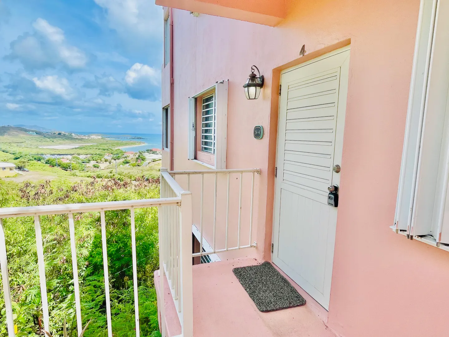 Walk into this renovated 2 bedroom, 2 bathroom Condo and be stunned by the big views of the ocean, Buck Island and the surrounding green valleys. It features an open floor concept kitchen, a large gallery and privacy as it is a corner unit at the end of the upper road. Enjoy the hillside breeze or A/Cs throughout the Condo. The unit comes fully furnished, with plenty of storage space as well as washer/dryer. All you need is your suitcase. This beautiful Condo is move-in ready for you, your vacation or long-term renters. HOA fees include insurance, internet, water, monthly pest control, an auto generator powering all units in the complex, a mailbox on site, a beautifully maintained pool and on-site management. A bonus are the restaurant ''the Goat'' and also a hair salon on property.