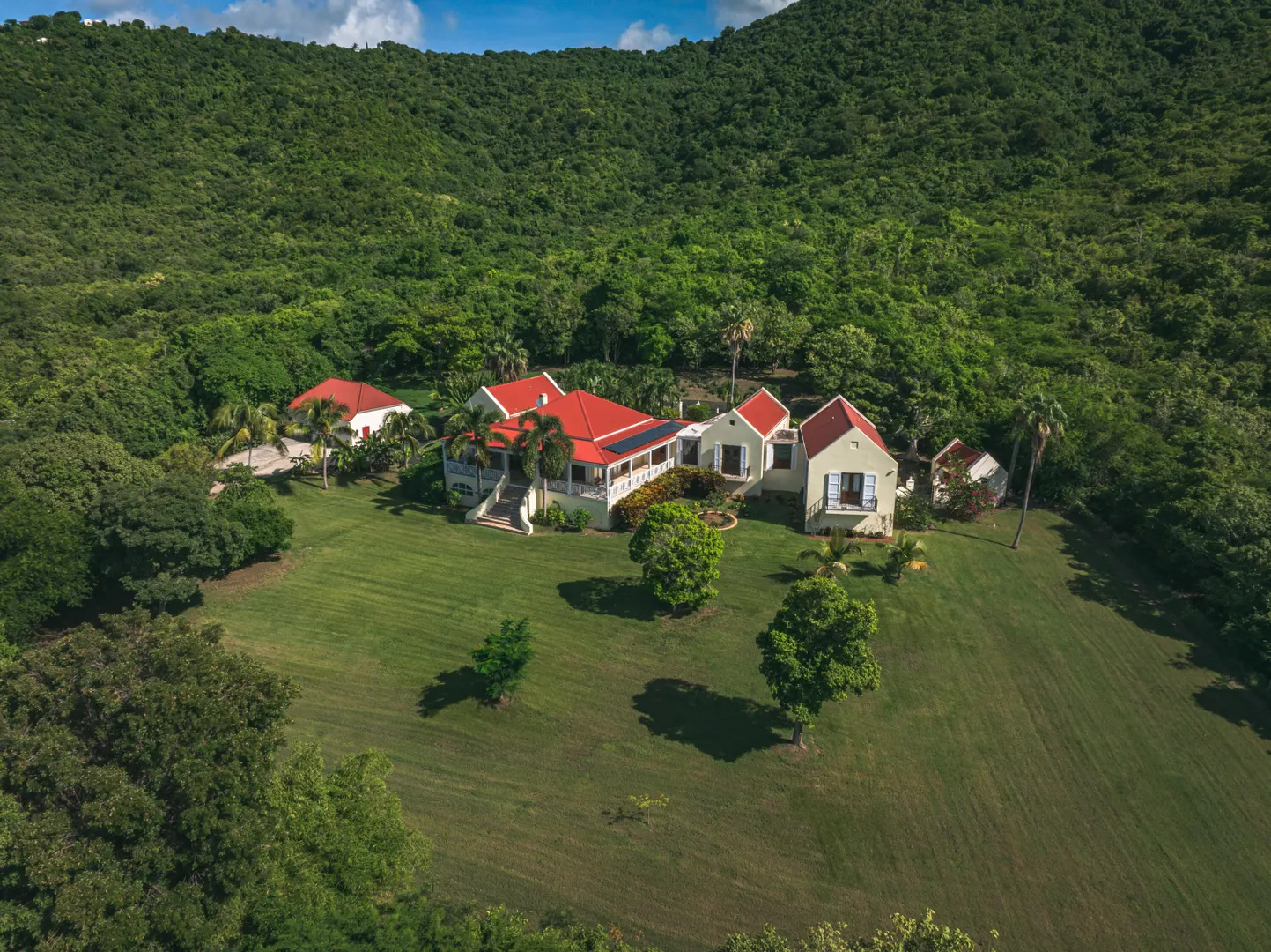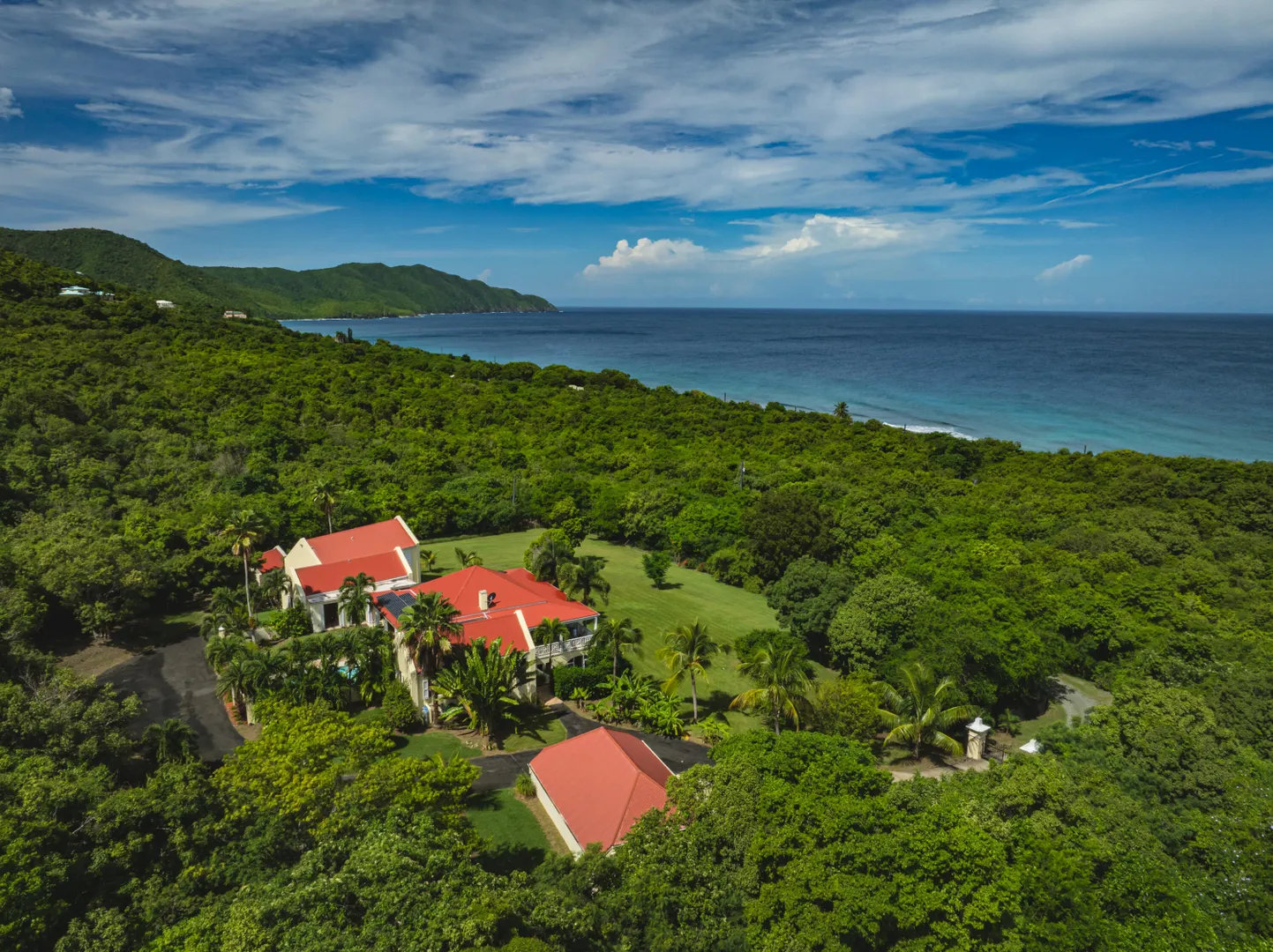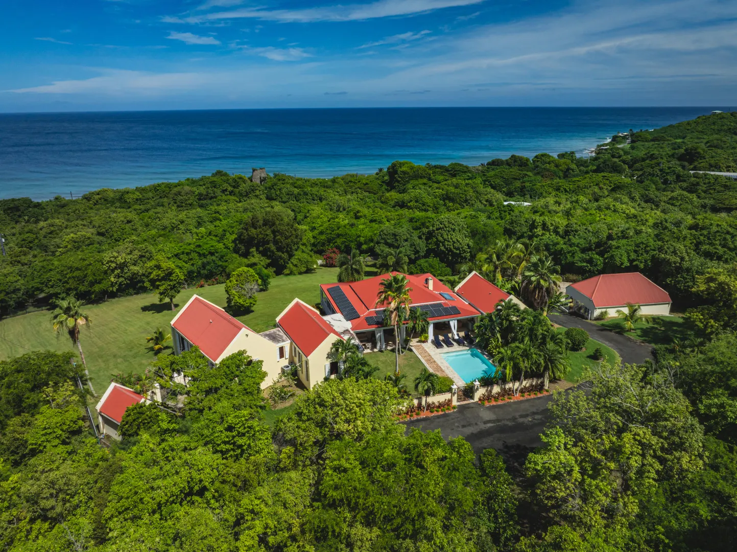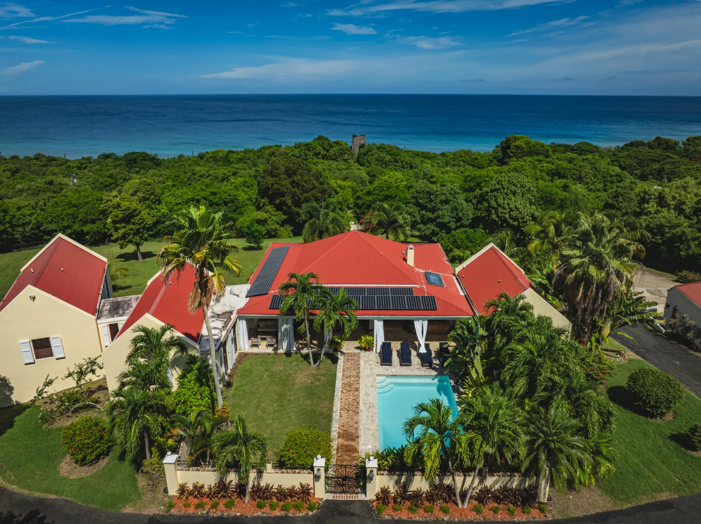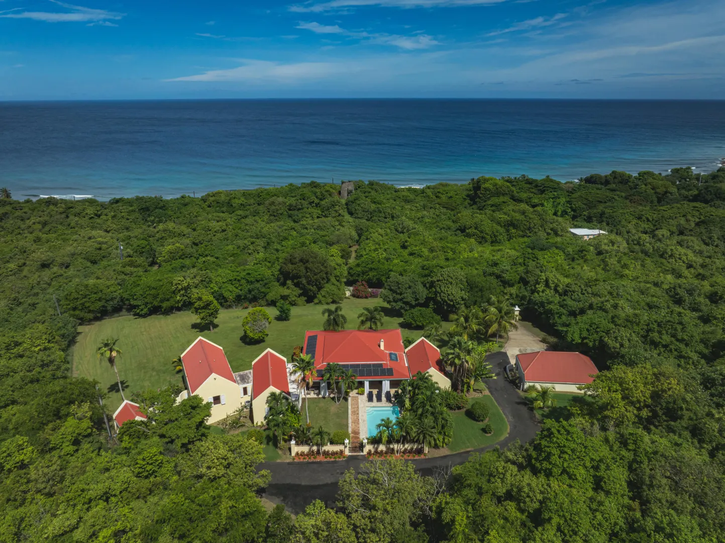 Estate Lucky Bottom: A rare piece of history in Cane Bay, this extraordinary 17.88-acre estate features a stately Greathouse with a saltwater pool and sweeping Caribbean Sea views, blending historic preservation with modern island luxury. The 4-bedroom, 4.5-bath residence, inspired by Danish colonial architecture, showcases Brazilian cherry and travertine floors, a solar power system with backup generator, and fine craftsmanship throughout. Behind the double gated entry--one at the road and another near the garage--beautifully landscaped grounds, with fruit trees, unfold across rolling hills, surrounding rare 1820 sugar-mill ruins with an intact animal slue--the only one of its kind on St. Croix. The grounds are abundant with mature specimen trees--mahogany, baobab,kapok, coconut palms, and fruiting varieties like guavaberry, banana, and Barbados cherrycreating a lush tropical landscape. The entire property is comprised of six separate parcels, offering complete control over privacy, access, and views across the estate. Ideally located near Cane Bay's beaches, diving, and dining, Estate Lucky Bottom offers timeless history, privacy, and sustainable island elegance.
