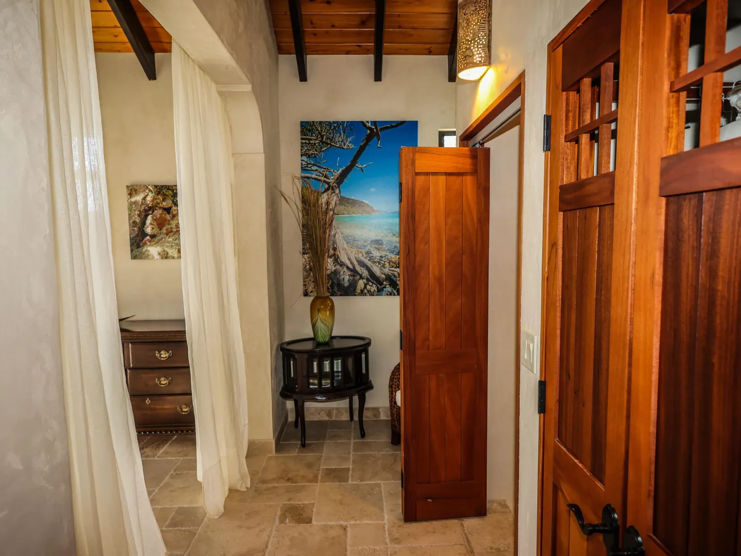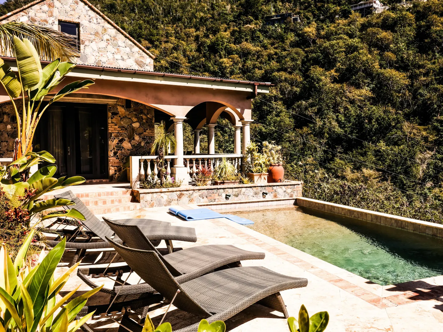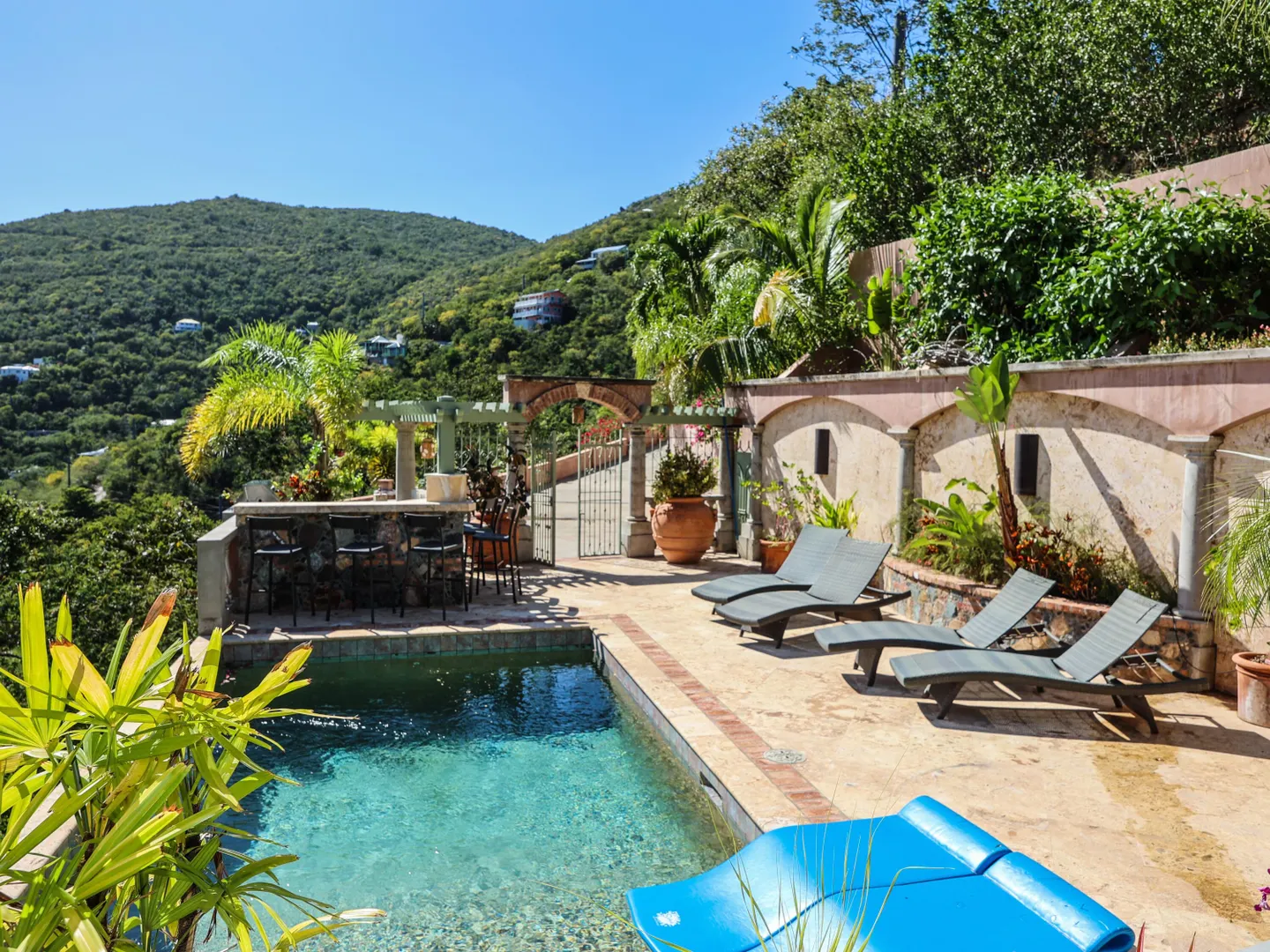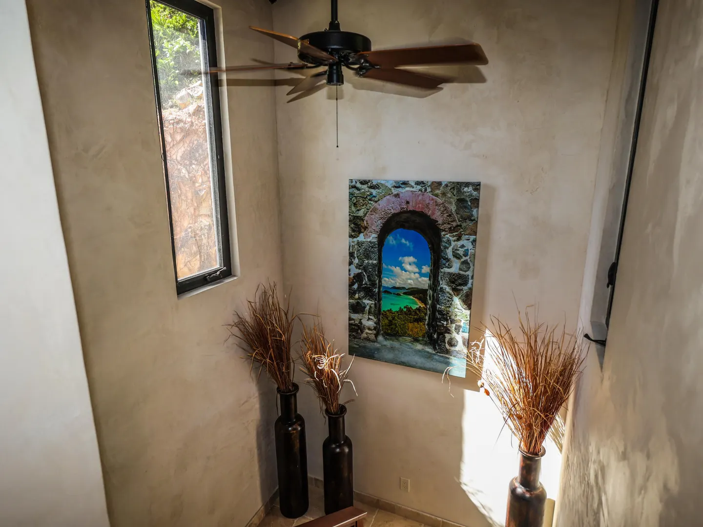 Immaculate home in secluded Fish Bay,in a peaceful neighborhood. This exquisitely furnished 2 bedroom 2 1/2 bath home features a private driveway with easy parking, mature landscaping, gorgeous views and breezes. A lovely pool deck and outdoor bar area allows for entertaining and relaxing. A large covered deck with outdoor dining and custom built brick pizza oven leads to the lower bedroom and outdoor shower. High vaulted ceilings and custom mahogany doors await you when entering the home. A spacious kitchen with concrete countertops and custom cabinetry for easy living. A stairwell leads to upper floor, to a sitting room and primary bedroom, bathroom with indoor and outdoor shower. House has a 26 KW Kubota diesel generator and transfer switch. 3 large storage areas bellow house
